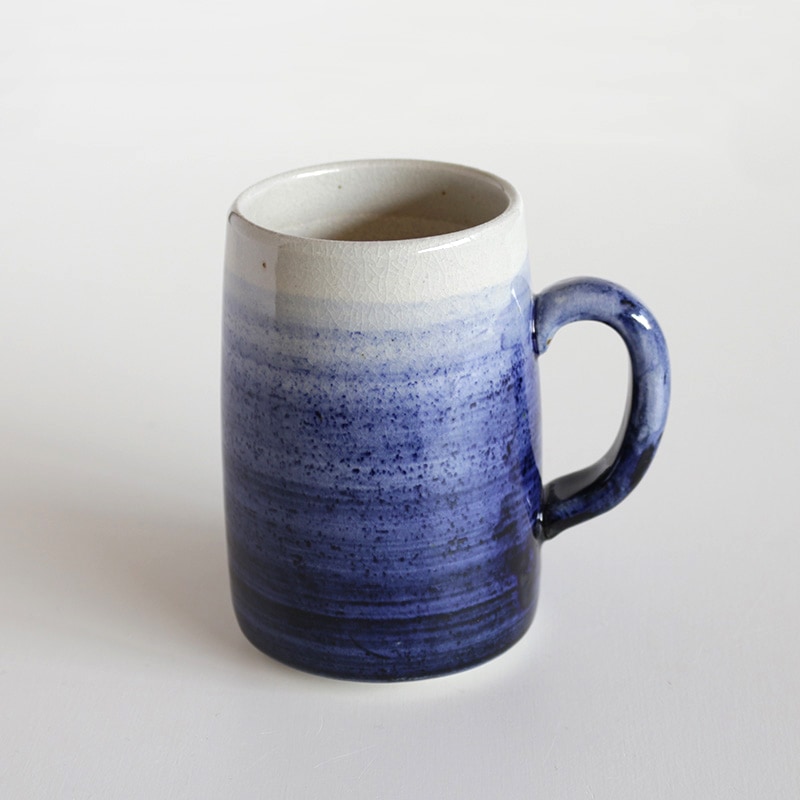 手描きの美しいグラデーション。黄昏時をイメージした『宵』は赤土(炻器)に上から下に薄くなるように刷毛で描き、朝焼けの空を思い起こさせる『明け』は白土(陶器)に下から上に薄くなるように描いています。吸い込まれるような青のグラデーションが印象的なシリーズです。