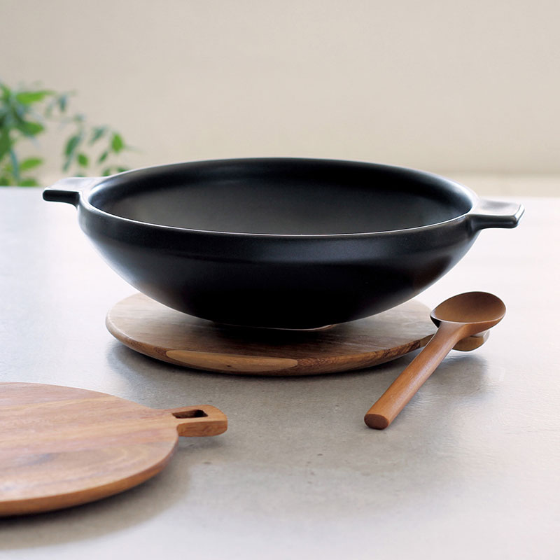 スープパンの鍋敷きには同じ「ツールズ」シリーズのウッドボード サークルをどうぞ。熱々をそのままテーブルへ、という時に、しっかりした厚みと大きさがあるので安心感があります。 またうつわとセットで贈り物にいかがでしょうか。