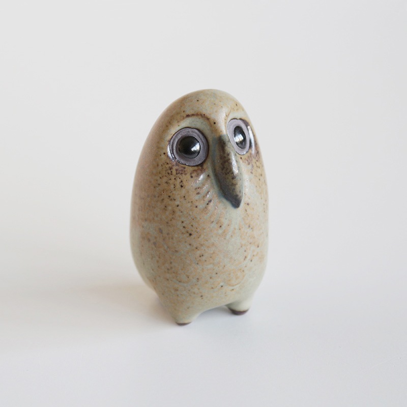 フクロウくん集合!左から貯金箱フクロウ・まるフクロウとS/Pフクロウ、真ん中の一番小さい子がオーナメントです。