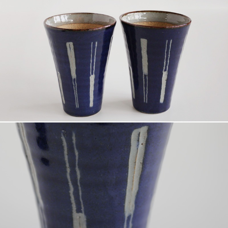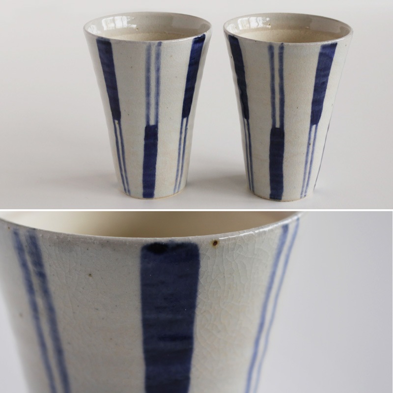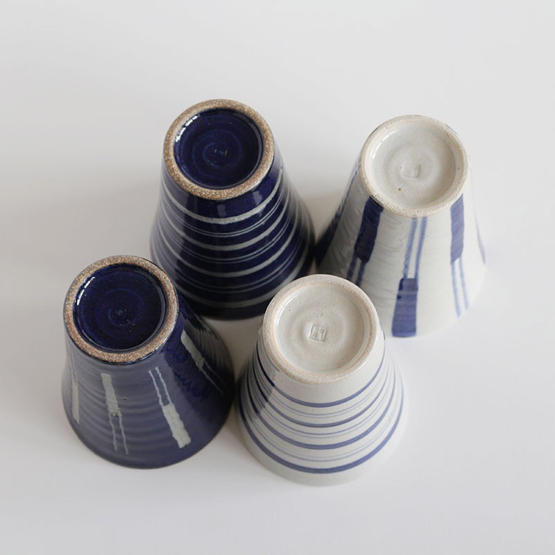 削り(藍)とハンドペイント(白)で一つ一つ絵付けしています。商品によって濃淡やにじみがでることもあります。陶土・釉薬の性質上、釉薬が白っぽく垂れたり、ピンホールと呼ばれる小さな凹みが表面に表れる事があります。